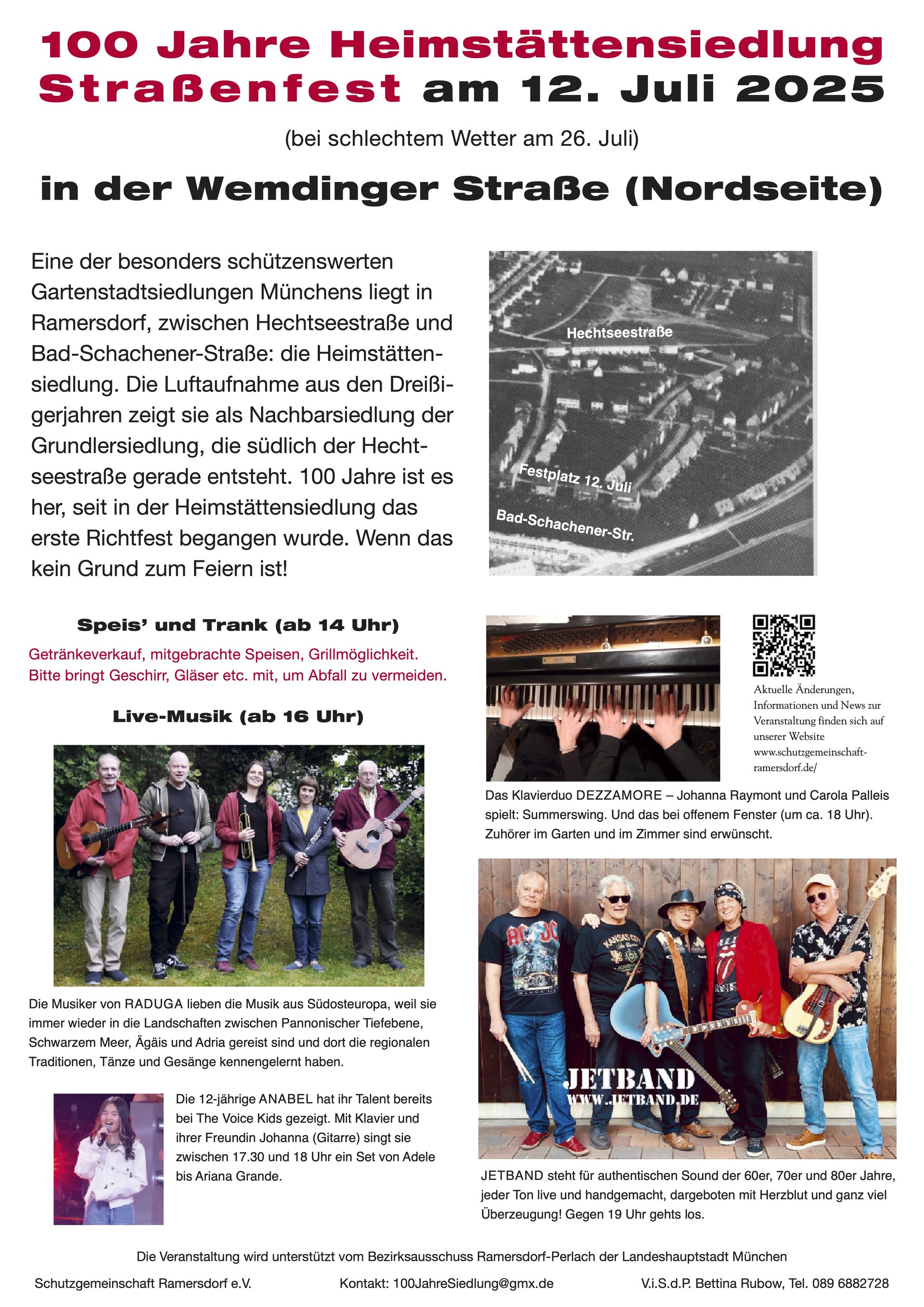 Zum Jubiläum gibt es ein wirklich phantastisches Musikprogramm aus Folk (aus Südosteuropa), Gesang, klassischem Klavier (alle drei Programmpunkte aus dem Viertel) und last but not least fetzigem Rock der Jetband. Es darf getanzt werden. Wir freuen uns auf euch! Bitte beachten: Kuchen- und Salatspenden für das Buffet sind herzlich willkommen, Fleisch zum Grillen bitte selbst mitbringen. Grillmöglichkeiten stehen zur Verfügung. Bitte beachtet zudem die Flyer, die wir in der Heimstättensiedlung verteilt haben. Unterstützt wird das Programm vom BA16 Ramersdorf-Perlach, für dessen großzügige Förderung wir uns herzlich bedanken!