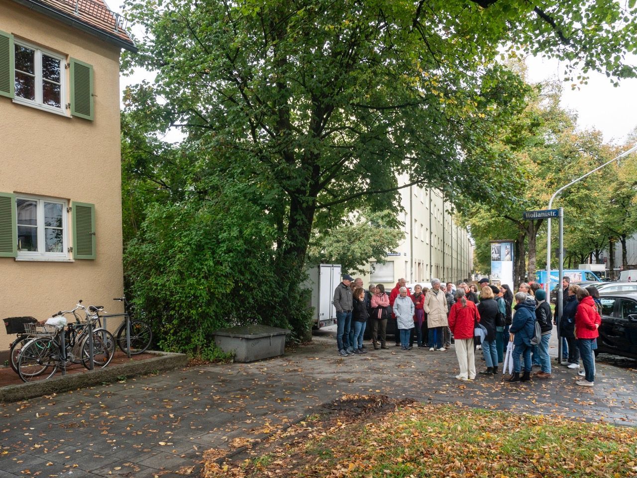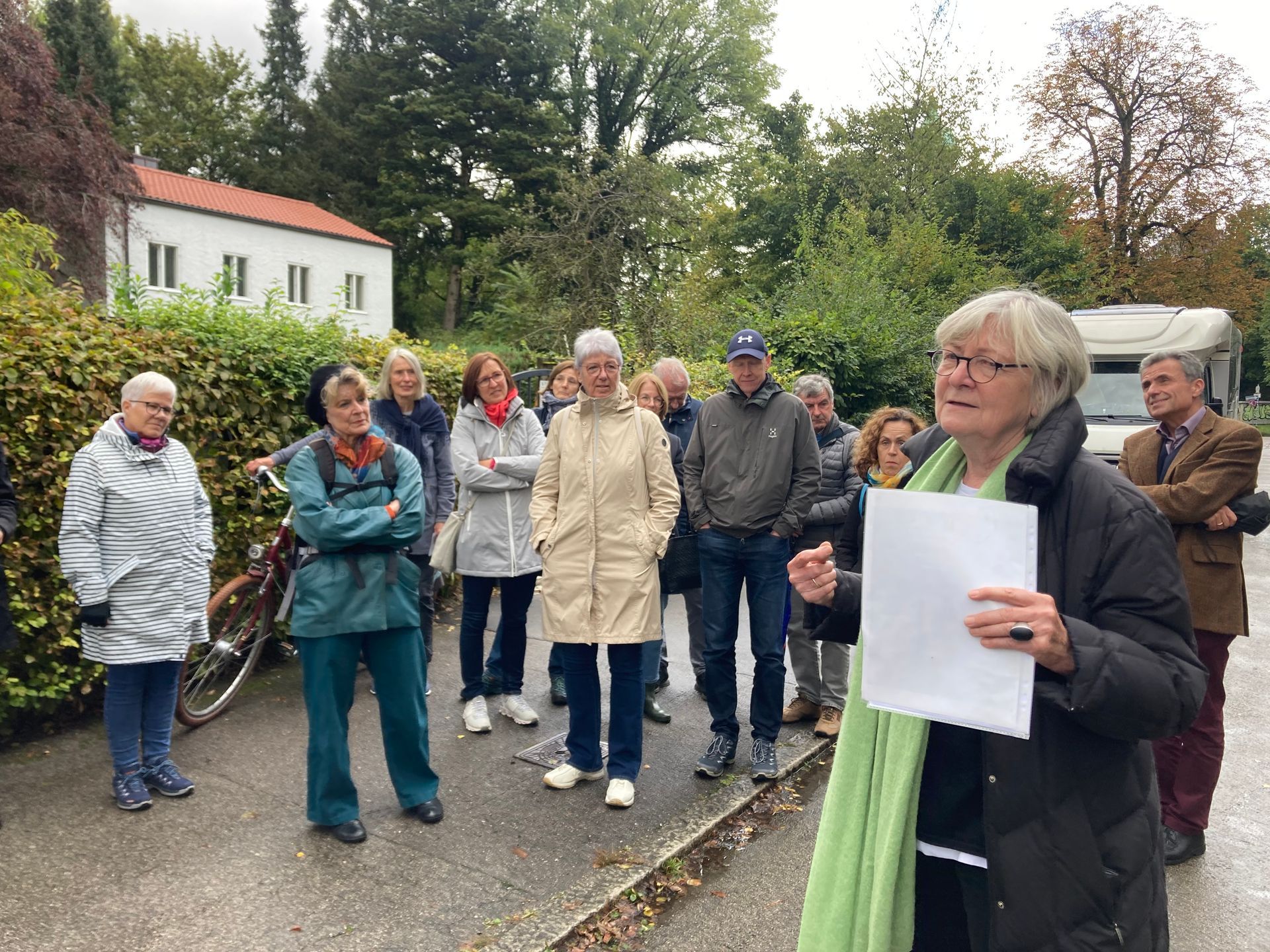 Wir hätten nicht gedacht, dass Ramersdorf so attraktiv auch für Nicht-Ramersdorfer und sogar für Leute aus Obermenzing und Haidhausen ist. Tatsächlich war die Liste der Anmeldungen rasch voll – und 35 Leute lauschten interessiert dem Vortrag des Architekten Christoph Randl, der durch die Wohnanlagen am Loehleplatz führte. Malerischer Städtebau, Staffelordnung Theodor Fischers, aber vor allem der Anblick des verwunschenen Loehleplatzes und der angrenzenden inzwischen komplett ensemblegeschützten Wohngebäude machten deutlich, wie wichtig bürgerschaftliches Engagement für den historischen Bestand ist, der ja an dieser Stelle massiv bedroht war.