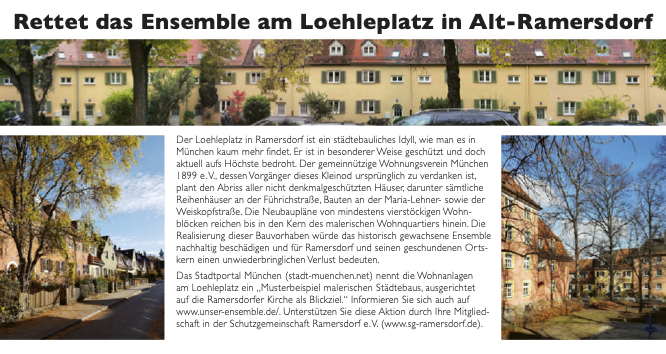 Der Loehleplatz in Ramersdorf ist ein städtebauliches Idyll, wie man es in München kaum mehr findet. Er ist in besonderer Weise geschützt und doch aktuell aufs Höchste bedroht. Der gemeinnützige Wohnungsverein München 1899 e. V., dessen Vorgänger dieses Kleinod ursprünglich zu verdanken ist, plant den Abriss der 6 nicht denkmalgeschützten Häuser an der Weiskopfstraße sowie sämtlicher Reihenhäuser an der Führichstraße.